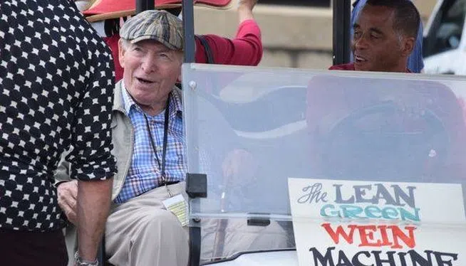 Festival founder George Wein takes a seat on stage to watch the show at the 2018 Newport Jazz Festival. Photo by Steve Klamkin WPRO News NEW YORK (AP) - George Wein, an impresario of 20th century musi...