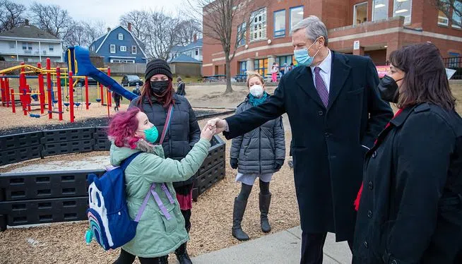 Governor Charlie Baker in Salem greets students, parents and teachers after the holiday break January 3, 2022. Photo courtesy Office of the Massachusetts GovernorSALEM, Mass. (AP) - Gov. Charlie Baker...