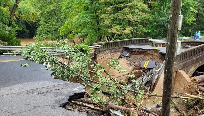 In a photo provided by the Connecticut Department of Transportation, workers Monday inspected a bridge washed out by flooding from intense rainstorms that fell in Southwestern Connecticut August 18, 2...