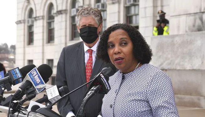 Sabina Matos talks with reporters outside the State House right after being sworn-in as Gov. Dan McKee’s choice as Rhode Island Lieutenant Governor. Photo by Steve Klamkin WPRO News PROVIDENCE, ...