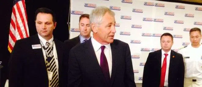 Secretary of Defense Chuck Hagel visited Newport Wednesday to speak to local members of the defense industry about the state and future of military technology.