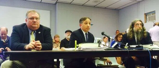 RI GOP Chairman Mark Smiley (left), RI GOP Attorney Brandon Bell (center) and Moderate Party Candidate Robert Healey (right). Photo by Andrew Augustus
