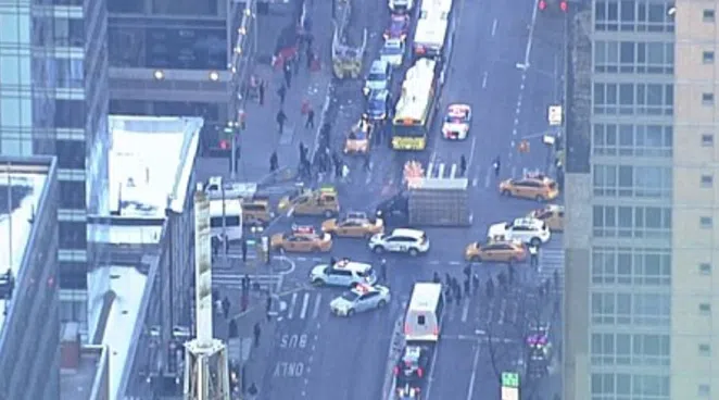NEW YORK (AP) — A man with a pipe bomb strapped to his body with Velcro and zip ties set off the crude device in the subway near Times Square on Monday, injuring him and three other people at the height of the morning rush hour.