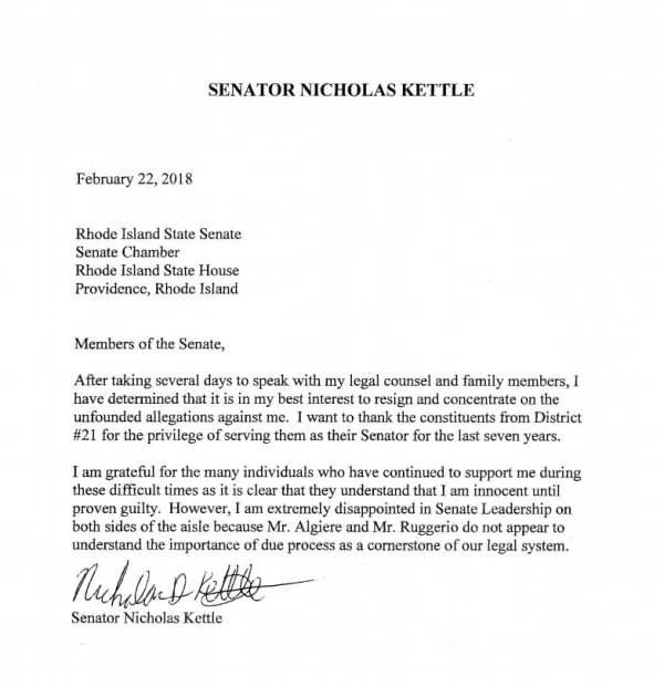 Coventry Republican Nicholas Kettle said in a letter Thursday that he has “determined that it is in my best interest to resign and concentrate on the unfounded allegations against me.”