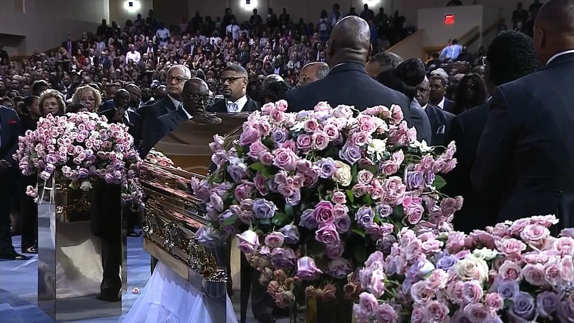 Her body arrived in a 1940 Cadillac LaSalle hearse. She wore a shimmering gold dress, with sequined heels — the fourth outfit Franklin was clothed in during a week of events leading up to her funeral.