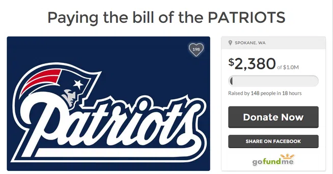 By Sam Wroblewski 630wpro.com Earlier this week, fans of the New England Patriots launched a Gofundme.com crowd sourcing page to raise $1 million to pay towards the team's fine levied against them by ...