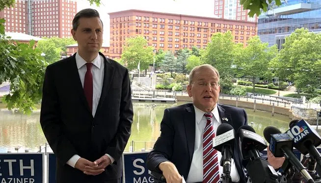 Seth Magaziner (left) is endorsed by retiring RI Congressman Jim Langevin at Waterplace Park in Providence June 30, 2022 over five other Democrats. Photo by Steve Klamkin WPRO News By Steve Klamkin WP...