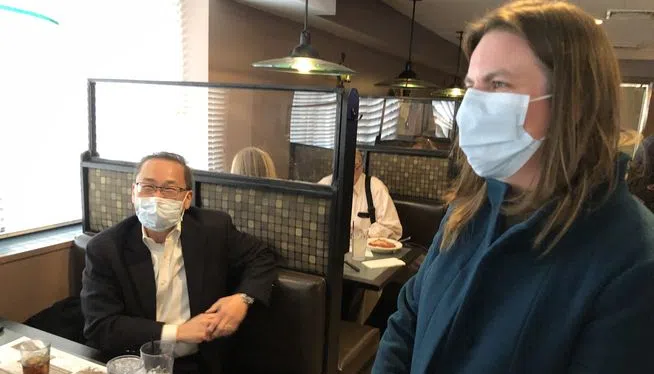 Democrat Joy Fox works the room at the Atwood Grill in Johnston February 8, 2022 in her campaign for Congress, running into diner and former Cranston Mayor Allan Fung, who is considering a Republican ...