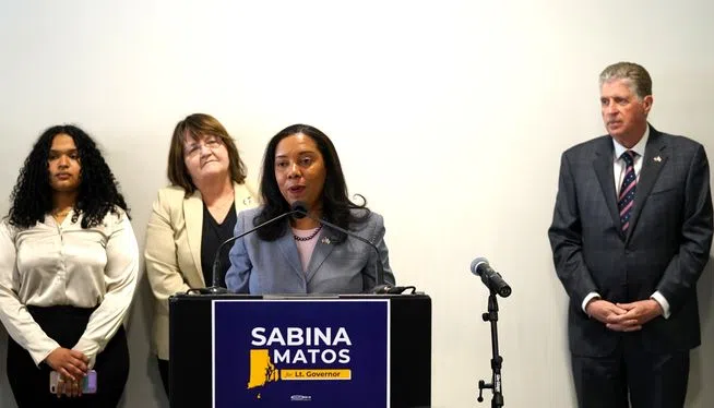 Rhode Island Lt. Gov. Sabina Matos and Gov. Dan McKee spoke at the kickoff of her campaign April 14, 2022. Photo by Steve Klamkin WPRO News By Steve Klamkin WPRO NewsRhode Island Lieutenant Governor S...