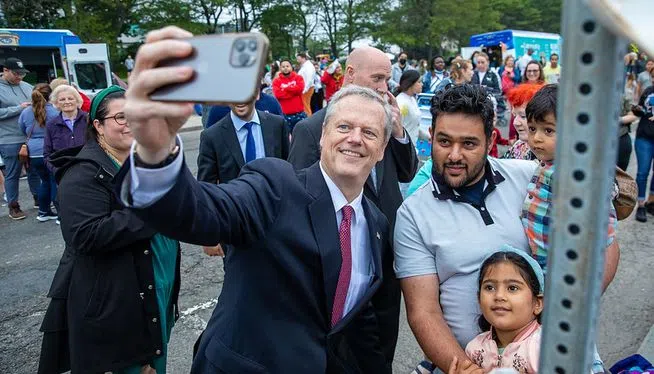 Mass. Gov. Charlie Baker takes a selfie at Revere Beach July 13, 2021 in this photo provided by the Mass. Governor’s Office BOSTON (AP) - Republican Gov. Charlie Baker said he's not surprised th...