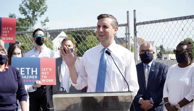 RI General Treasurer Seth Magaziner announces his candidacy for the Democratic nomination for governor on September 14, 2021. Photo by Steve Klamkin WPRO News PAWTUCKET, R.I. (AP) - Rhode Island Gener...