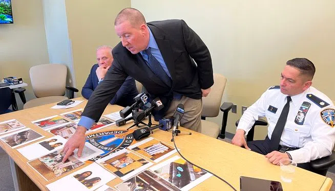 Providence Police Detective Captain Roger Aspinall points out photos detailing a major fentanyl bust as (from left) Major David Lapatin and Acting Chief Oscar Perez look on January 31, 2023. Photo by ...